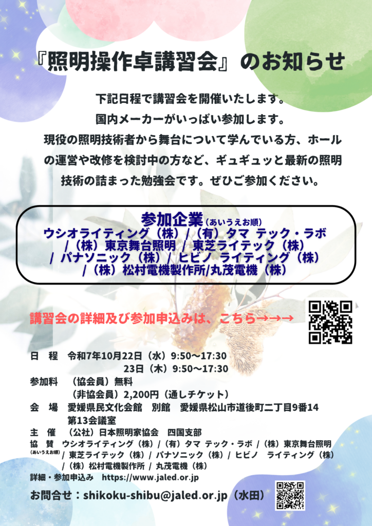 四国支部主催による「照明操作卓講習会」を開催いたします。